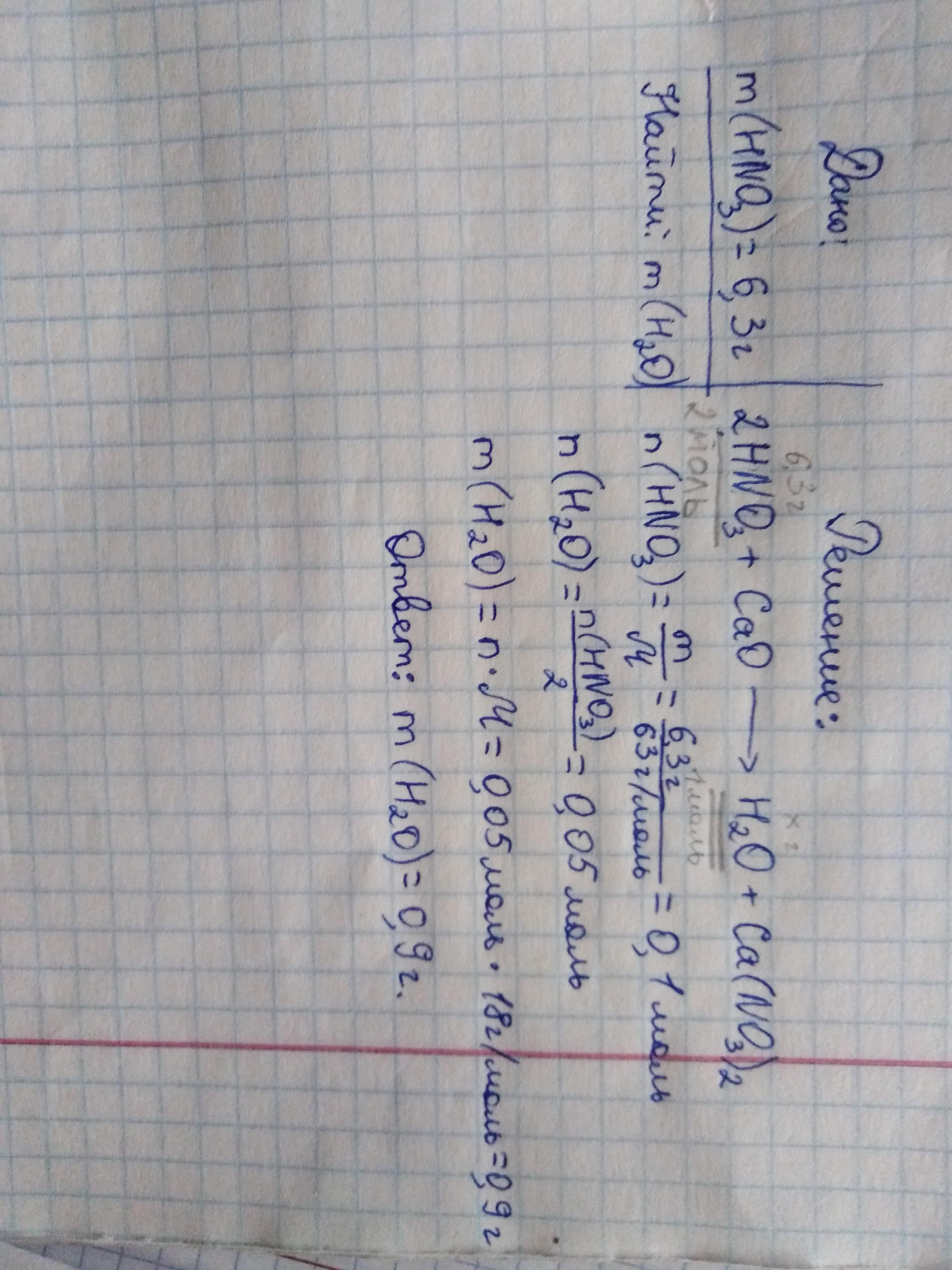 Определите массу воды , образующейся при реакции 6,3 г азотной кислоты с оксидом кальция