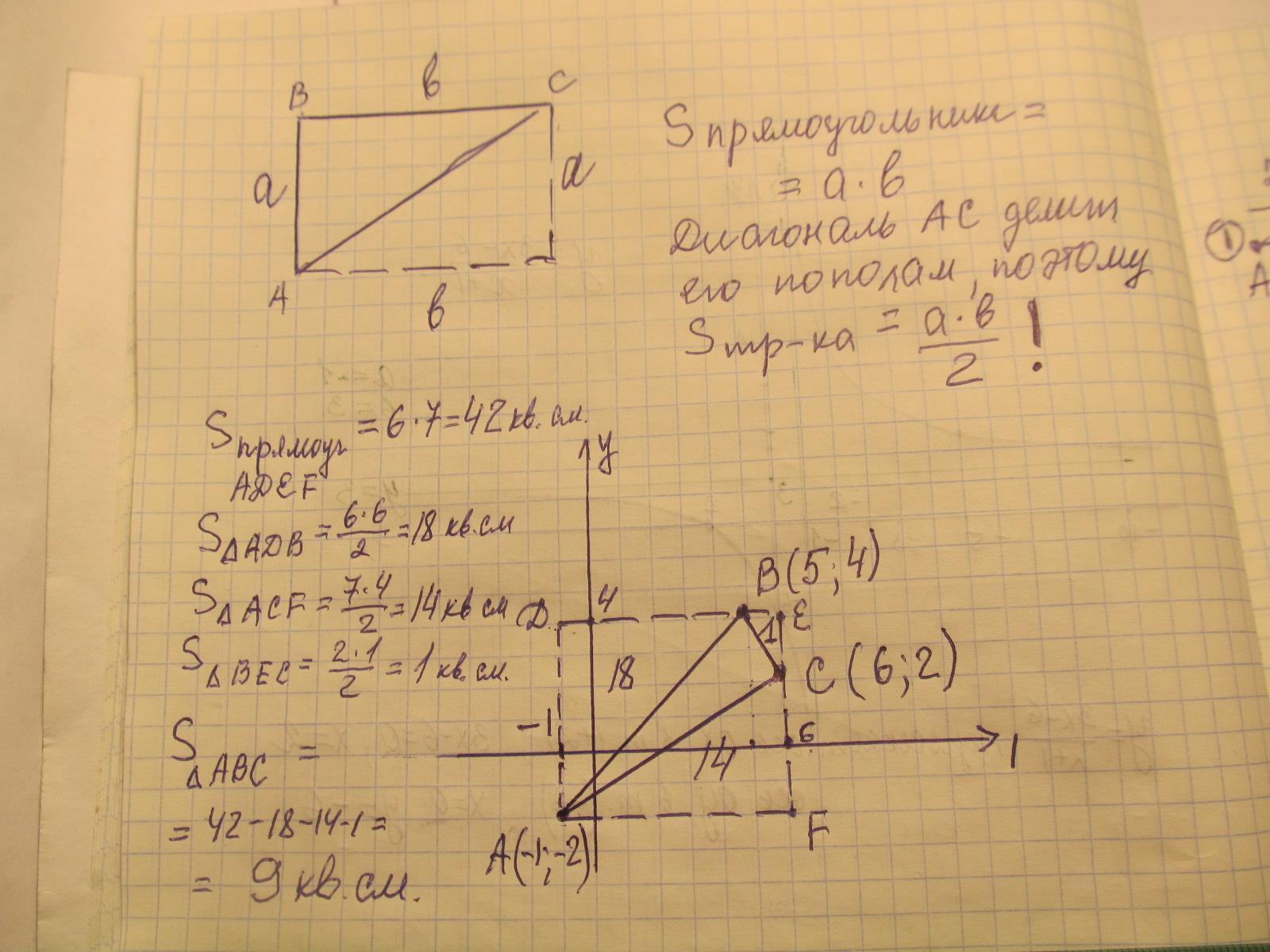Начертите треугольник, вершины которого находятся в точках A(-1;-2), B(5, 4), С(6; 2), и вычислите его площадь.