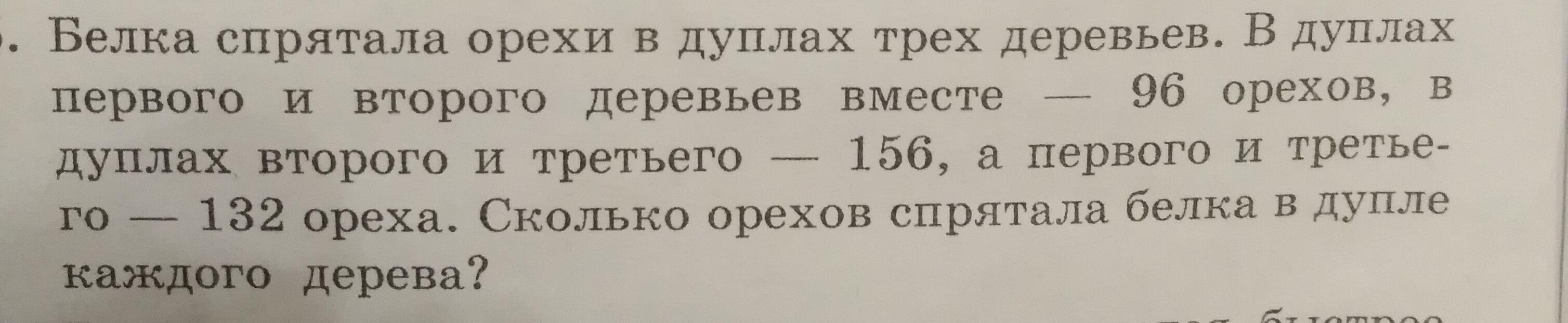 Если мы сложим орехи, спрятанные белкой в дуплах первого и второго, второго и третьего, первого и третьего деревьев, то получим удвоенное количество орехов, спрятанных белкой в дуплах всех трех деревьев. Следовательно, всего белка спрятала (96 + 156 + 132): 2 = = 192 ореха. В дупле первого дерева 192 - 156 = 36 орехов, в дупле второго дерева 192 - 132 = 60 орехов, в дупле третьего дерева 192 - 96 = 96 орехов.