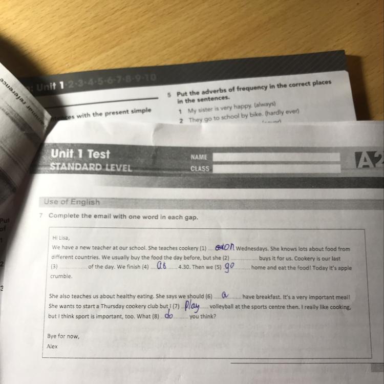 She also teaches us about healthy eating. She says we should (6) always have breakfast. It's a very important meal! She wants to start a Thursday cookery club but I (7) am playing volleyball at the sports centre then. I really like cooking, but I think sport is important, too. What (8) do you think?
