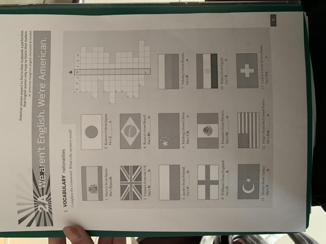 2.Japanese 3. british 4.Brazilian 5.Polish 6.Chinese 7.Russian 8.English 9. Mexican 10.Egyptian 11.Turkish 12. American 13. Swiss