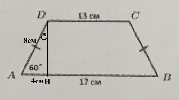 В прямоугольном треугольнике ADH катет АН лежит против угла 30°(по сумме острых углов прямоугольного треугольника). Значит AD = 2·2 =4 см (гипотенуза).