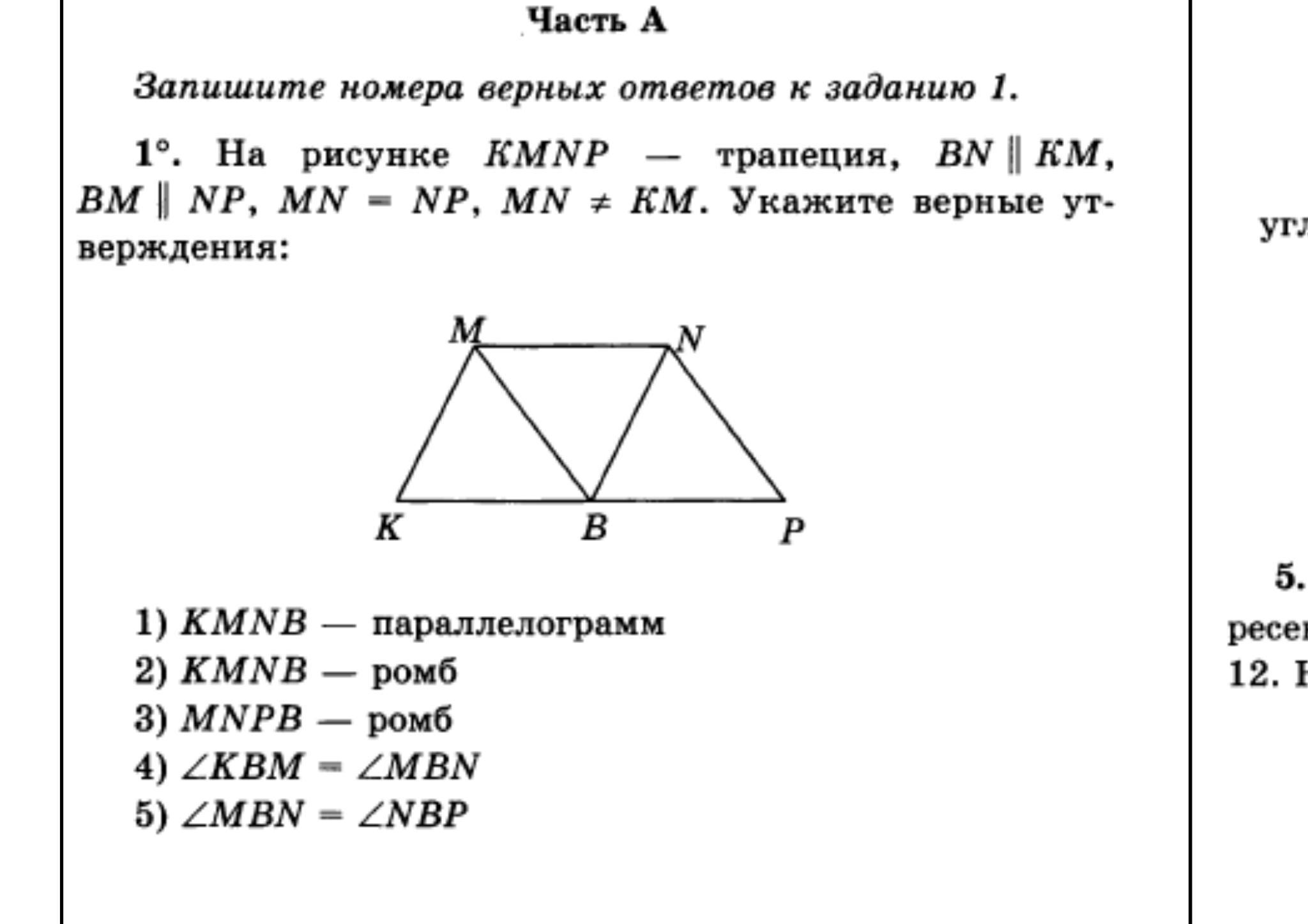 3) верно,потому что MN=NP(по условию),NP=MB,MN=BP(по свойству параллелограма(MNPB - параллелограм потому что BM параллельно NP(по условию) и основания трапеции тоже параллельны)),следовательно все стороны этого параллелограма равны,значит он ромб
