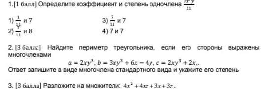 1) Коэффициент при многочлене узнать просто: это вещественное число, стоящее перед множителями хᵃ и уᵇ. Где a, b - степени множителей соответственно х и у. В данном случае коэффициент равен . Теперь, чтобы узнать степень одночлена, надо сложить степени при х и у: