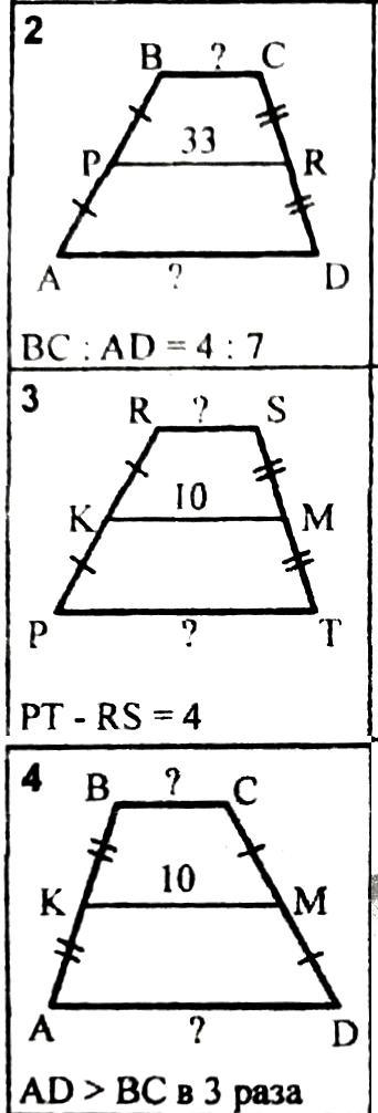 4) KM - средняя линия трапеции ABCD. Пусть BC = x, тогда AD = 3x. По свойству средней линии трапеции:
