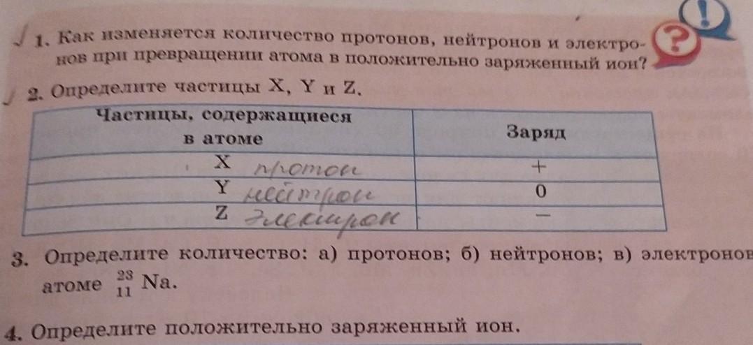1. За заряд иона отвечает количество электронов. При превращении атома в положительно заряженный ион уменьшается число электронов, а количество протонов и нейтронов остаётся таким же.