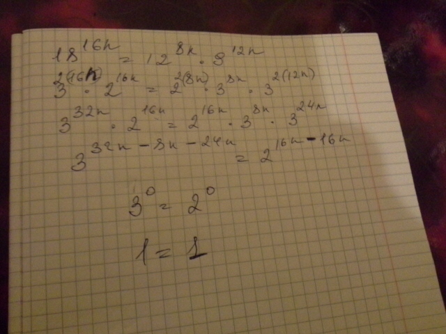 Доведіть тотожність 18 в 16 степени н = 12 в 8 степені н помножити на 9 в 12 степені н !!!! якщо н - натуральне число )))))))))))