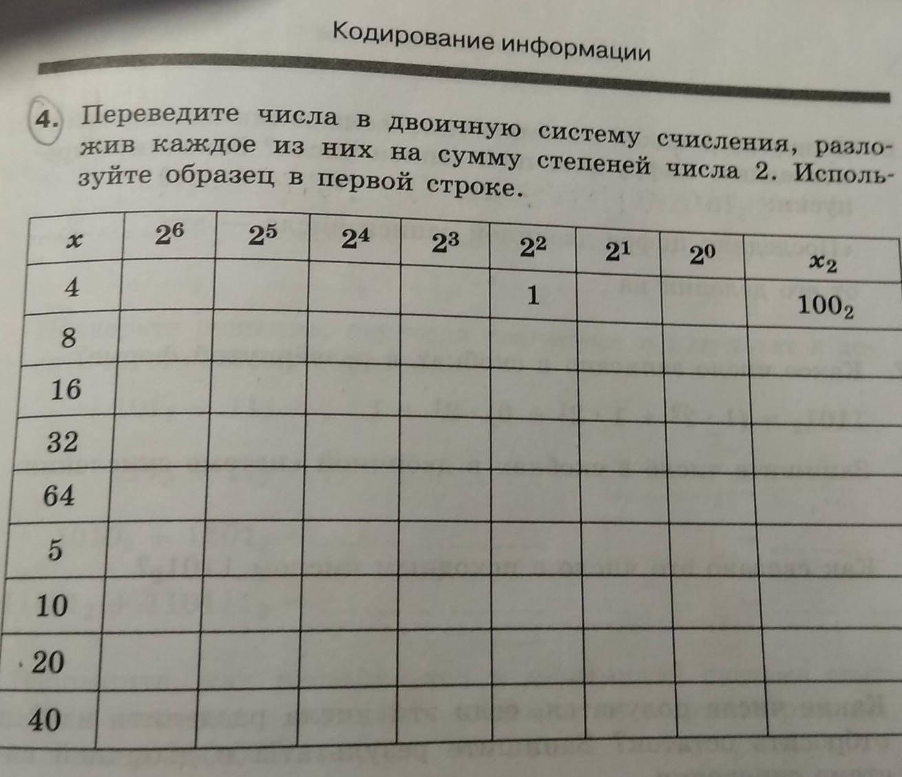 40₁₀ = 0*2⁰ + 0*2¹ + 0*2² + 1*2³ + 0*2⁴ + 1*2⁵ = 101000₂