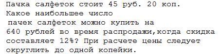 45,2*88% = 45,2*88:100 = 3977,6:100 = 39,776 ≈ 39,78 - цена пачки салфеток с учётом скидки.