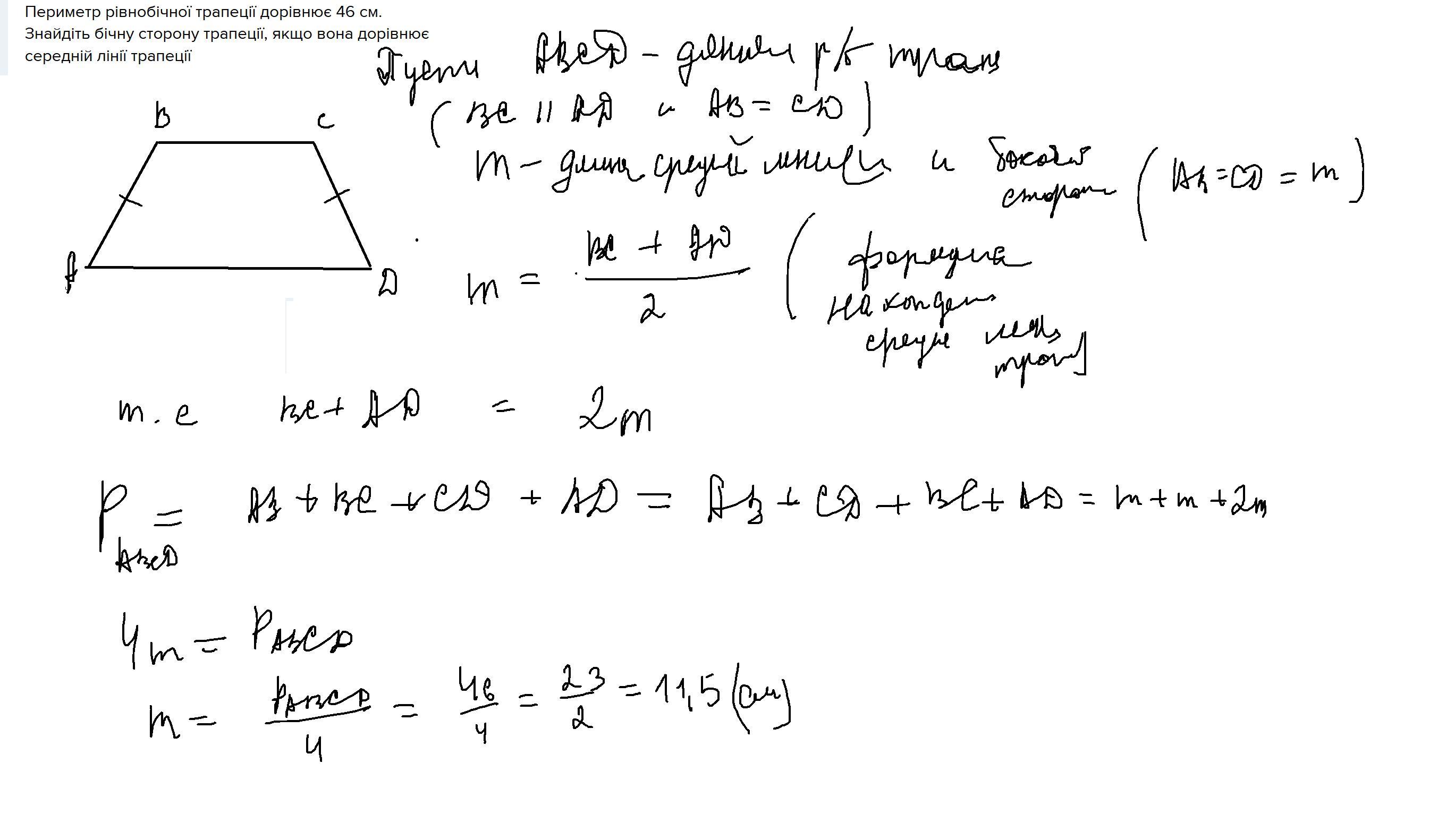 Периметр рівнобічної трапеції дорівнює 46 см. Знайдіть бічну сторону трапеції, якщо вона дорівнює середній лінії трапеції