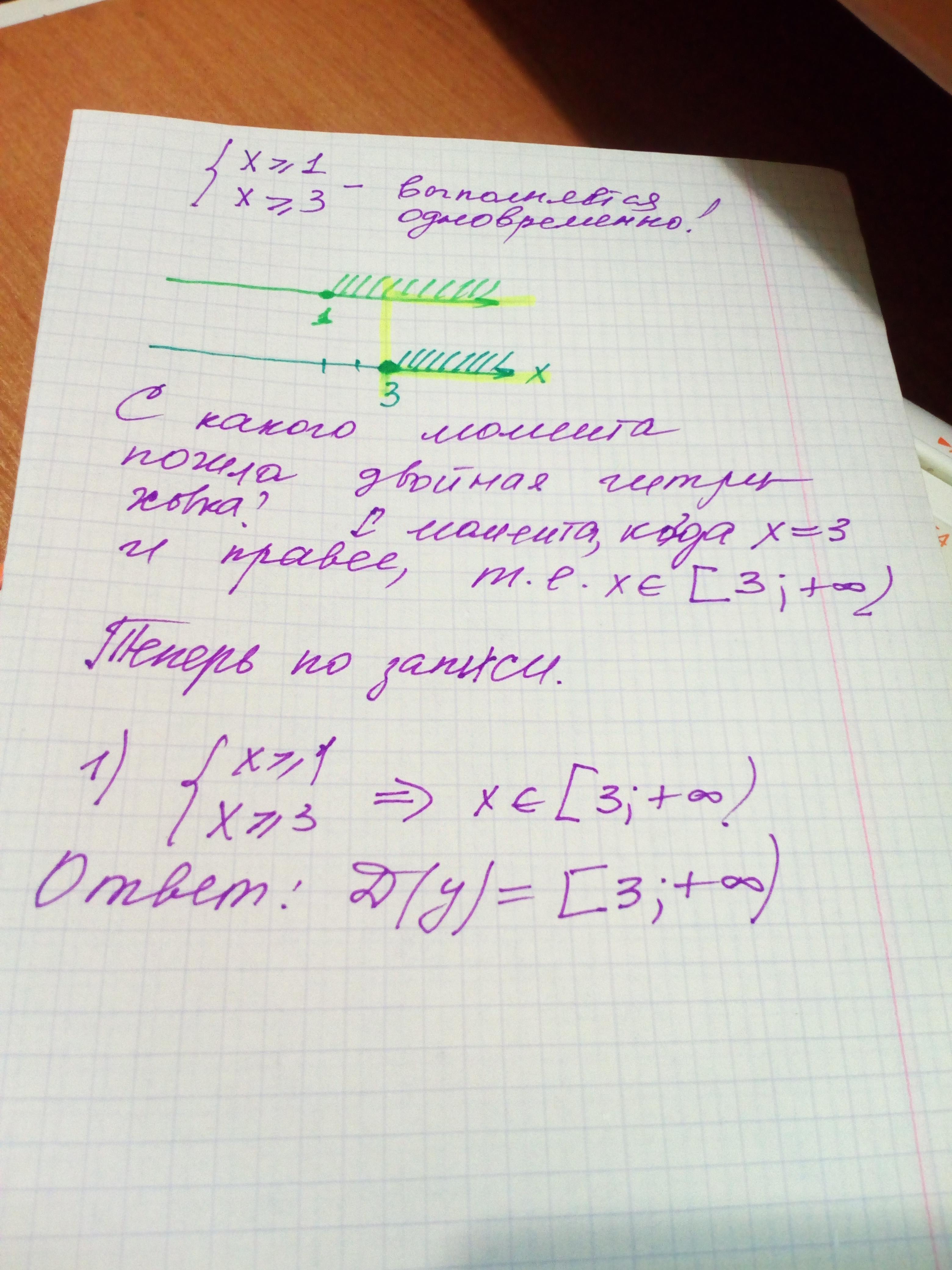 сначала немного лирики. А потом по сути, как грамотно оформить решение. Подкоренное выражение должно быть неотрицательным, это не секрет. Верно? Рисуем х-1≥0; х-3≥0.