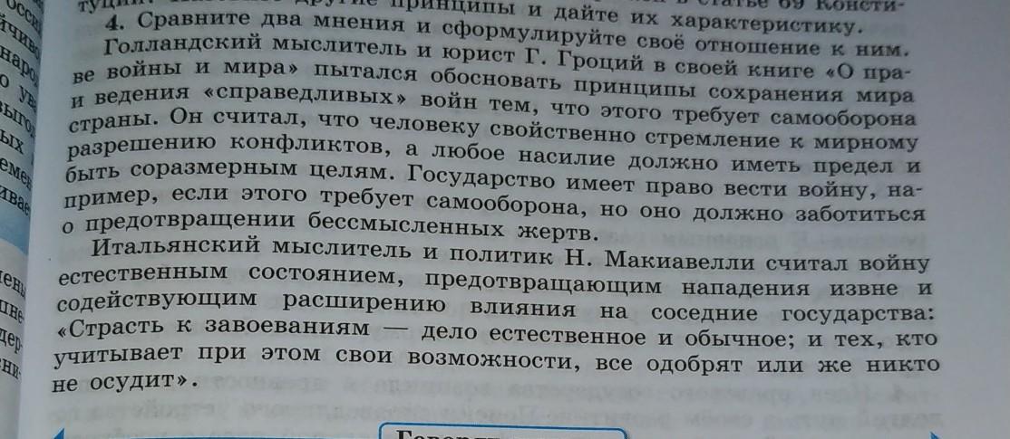 Первое мнение говорит о том, что голландский мыслитель Гроций был человек миролюбивый и имел мирные взгляды на жизнь и строение общества, тогда как второй Макиавелли придерживался воинственных настроений и считал, что нападение лучшая защита. Мне, как человеку миролюбивому более близко мнение первого из них, т.е. Гроция. Я считаю, что государство должно вести войну, тогда, когда того требуют обстоятельства, но должно всегда быть к ней готовым, но также как сказал Гроций, избегать бессмысленных жертв.
