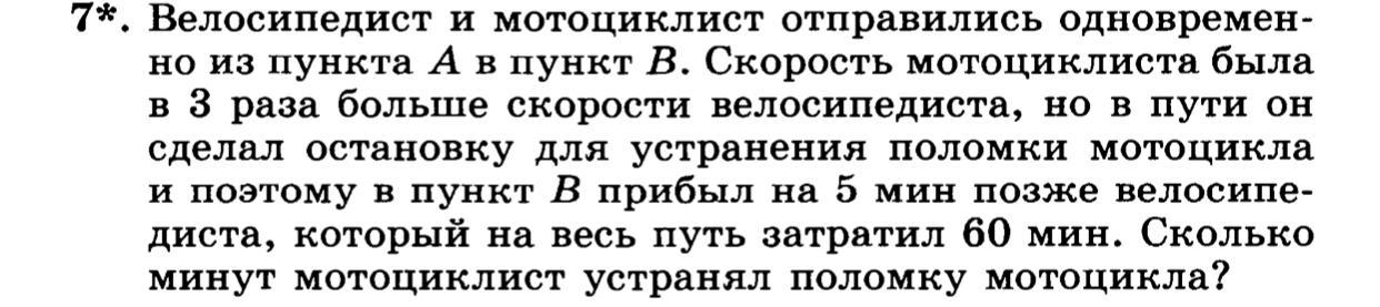 скорость мотоциклиста в 3 раза больше, значит, без остановки, его время было бы в 3 раза меньше. 60:3=20 минут