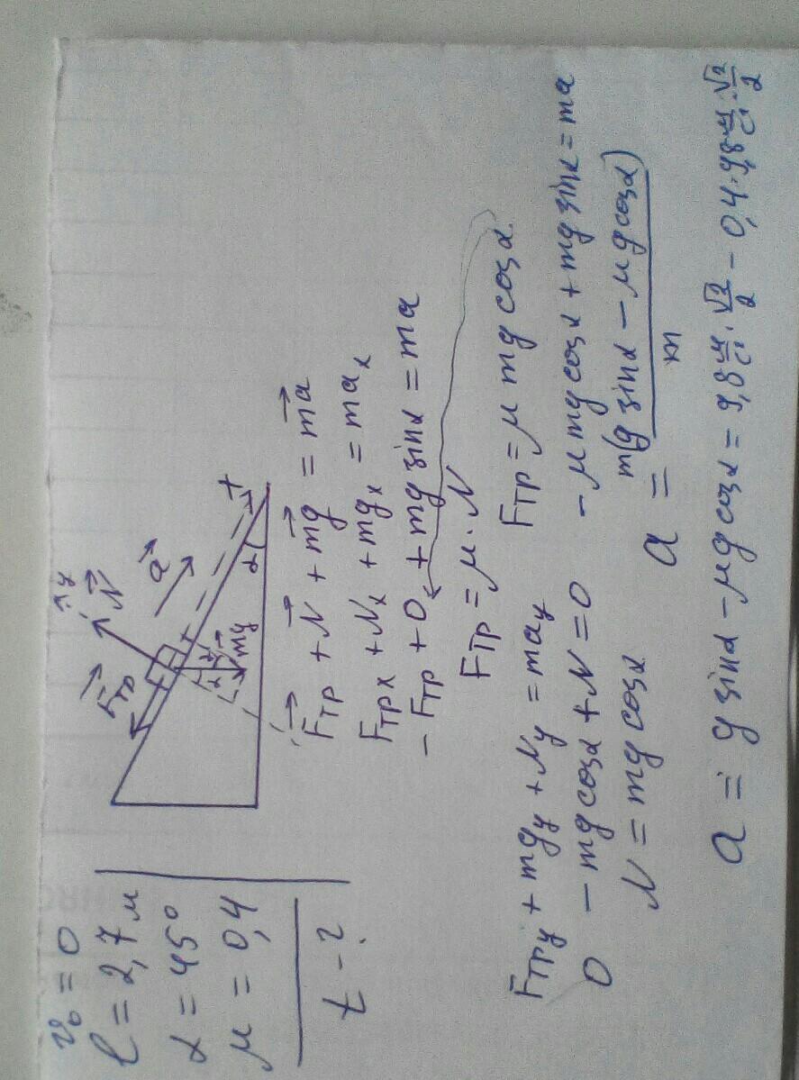 За какое время съедет тело с наклонной плоскости длиной 2,7 м, наклоненной под углом 45 к горизонту, если коэффициент трения составляет 0,4?