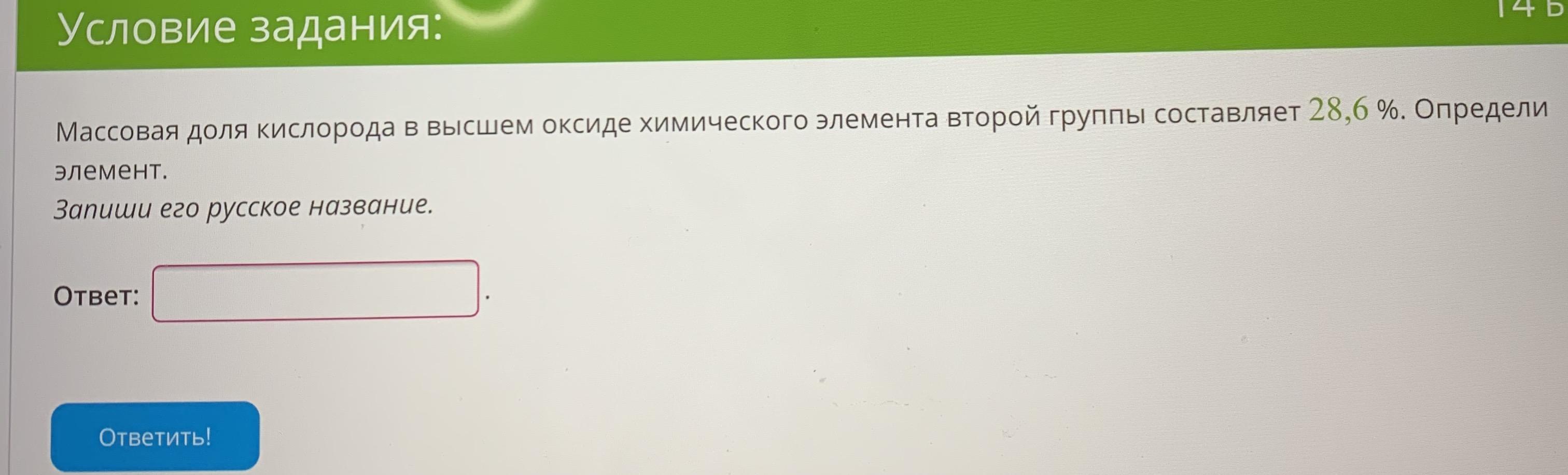 Высший оксид второй группы имеет вид RO. Если кислорода в массовой доли, 28,6 процента, то нашего искомого элемента там 71,4.
