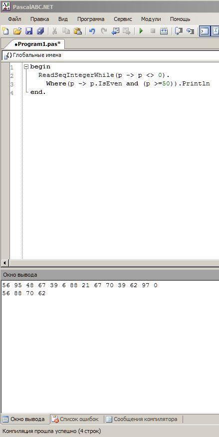 С клавиатуры вводится последовательность натуральных чисел, оканчивающихся числом 0. Количество чисел в последовательности неизвестно. Программа должна вывести на экран четные числа из этой последовательности, которые не меньше 50.