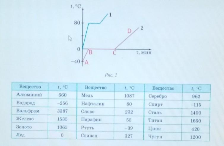 А выше мы уже определились что горизонтальные участки на графиках соответствую температурам Плавление этих двух веществ. Поэтому в таблицы мы находим два вещества у которых температуры Плавление равны 80 °C Выше мы уже определились что горизонтальные участки на графиках соответствую температурам Плавление этих двух веществ. Поэтому в таблицы мы находим два вещества у которых температуры Плавление равны 80 °C и 0 °C. Согласно таблицы этими веществами являются лёд с температурой Плавление 0 °C и нафталин с температурой Плавление 80 °C