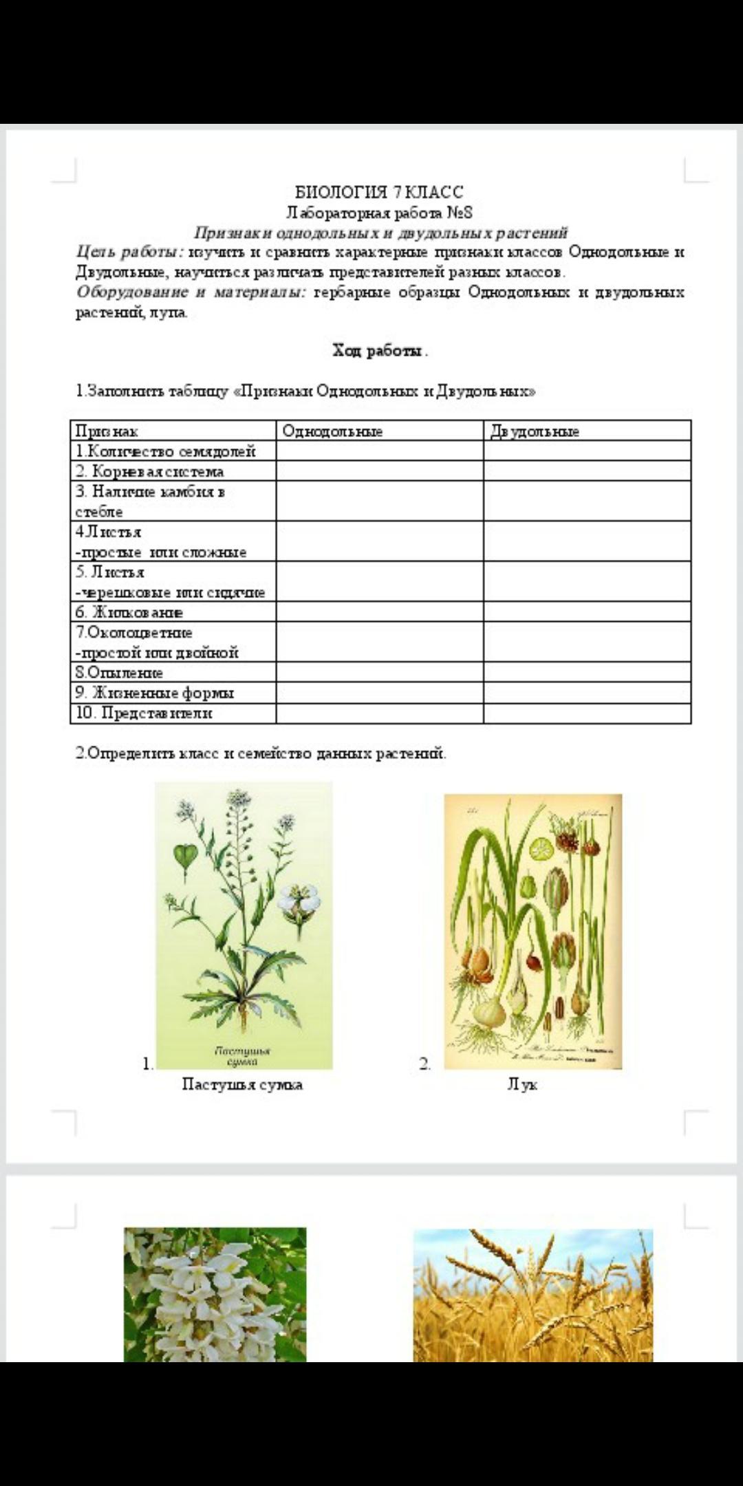 У однодольных, как правило, одна семядоль, мочковатая корневая система, простые черешковые листья, дуговое или же параллельное жилкование, а вместе с тем простой околоцветник. У однодольных обычно не образуется камбий, большинство из них - травы, опыляются они с помощью ветра. У двудольных в свою очередь две семядоли, стержневая или мочковатая корневая система, сложные сидячие листья, перистое или пальчатое жилкование и двойной околоцветник. Представителями данного класса могут быть различные формы жизни, в них обычно образуется камбий, а опыляются они насекомыми.