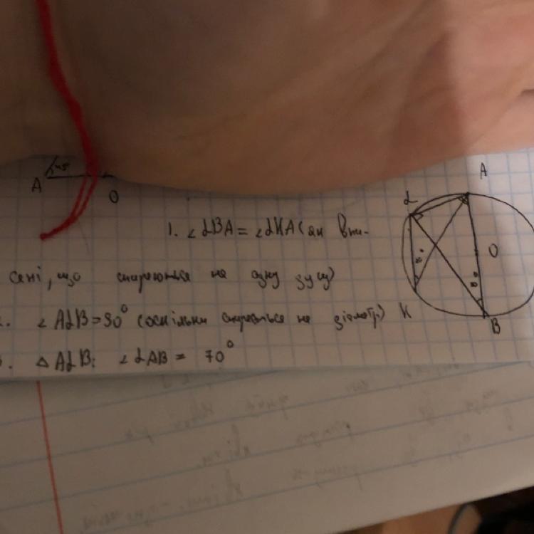 Точка О - центр кола, кут LKA = 20° . Знайти градусну міру кута LAB