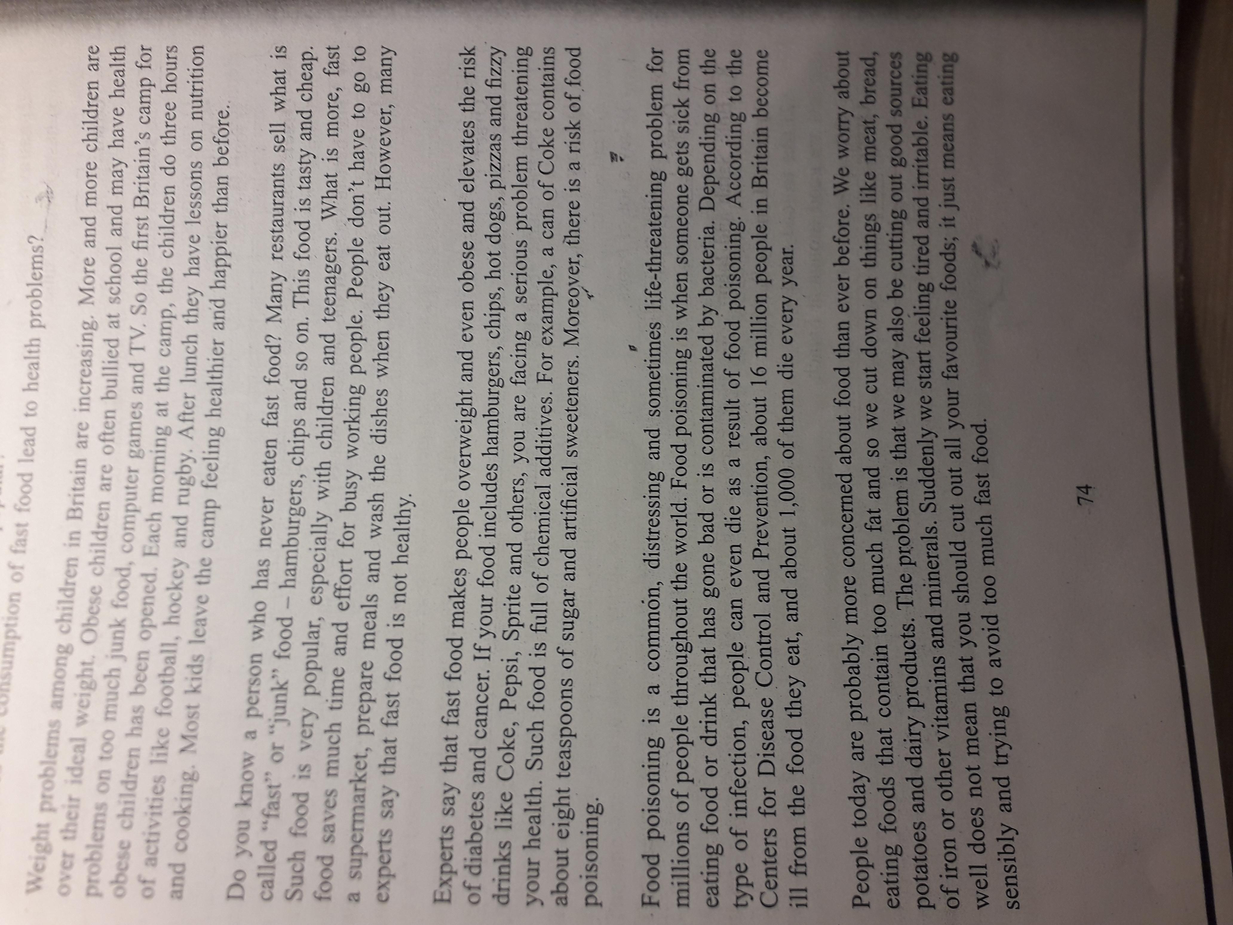 Вагові проблеми серед дітей у Дейтаїні зростають. Більше і кобили діти мають ідеальну вагу. Ожирінні діти часто знущаються в школі і можуть мати hiea robiems надто багато нездорової їжі, комп'ютерних ігор та телевізора. Тож був відкритий перший табір британців для дітей-егі. Кожен момент в таборі діти займаються трьома ведмедиками, такими як футбол, хокей та нагбі. Після обіду вони проходять уроки з приготування їжі та приготування їжі Більшість дітей залишають табір, відчуваючи себе здоровішими та щасливішими, ніж раніше. Чи знаєте ви людину, яка ніколи не їла фаст-фуд? Багато ресторанів продають так звану "швидку" або "нездорову" їжу - гамбургери, чіпси тощо. Ця їжа смачна і дешева. Така їжа дуже популярна, особливо у дітей та підлітків. Що таке парубок, остання їжа економить багато часу та сил для зайнятих працюючих людей. Людям не потрібно так супермаркет, готувати страви та мити посуд, коли вони їдять на вулиці. Однак багато фахівців стверджують, що фаст-фуд - це не здорово. Фахівці стверджують, що фаст-фуд робить людей надмірною вагою і навіть ожирінням і підвищує ризик діабету та раку. Якщо у вашу їжу входять гамбургени, чіпси, хот-доги, піци та газовані напої, такі як кокс, пепсі, спрайт та інші, ви стикаєтесь із страшною проблемою, що загрожує здоров’ю. Така їжа насичена хімічними добавками. Наприклад, банка коксу містить близько восьми чайних ложок цукру та штучних підсолоджувачів. Більше того, існує ризик вживання їжі Sunuostod Харчове отруєння - це загальна проблема, яка страждає, а іноді і загрожує життю для мільйонів людей у всьому світі. Харчове отруєння - це коли хтось захворів від котирування їжі чи напоїв, що перейшли або забруднені бактерії. Залежно від типу інфекції, люди можуть навіть померти внаслідок харчового отруєння. За даними Центрів контролю та профілактики захворювань, близько 16 мільйонів людей у Британії стають iTll від їжі, яку вони котять, і близько 1000 з них гинуть щороку. Сьогодні люди, ймовірно, більше, ніж коли-небудь раніше. Ми хвилюємось вживати в їжу продукти, що містять занадто багато жиру, і 30 ми скорочуємо такі речі, як м'ясо, гострої картоплі та молочних продуктів. Проблема полягає в тому, що ми можемо також вирізати хороші джерела заліза або інших вітамінів і мінералів. Раптом ми починаємо обдурювати титрод і іррітале Іейн добре не означає, що вам слід вирізати всі ваші улюблені страви; це означає, що їсти розумно і намагатися уникати занадто багато фаст-фуду.