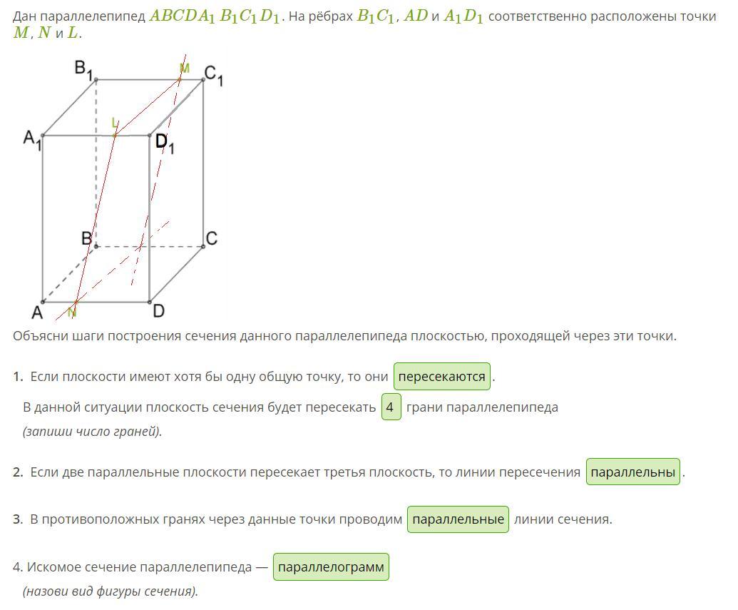 Объясни шаги построения сечения данного параллелепипеда плоскостью, проходящей через эти точки.