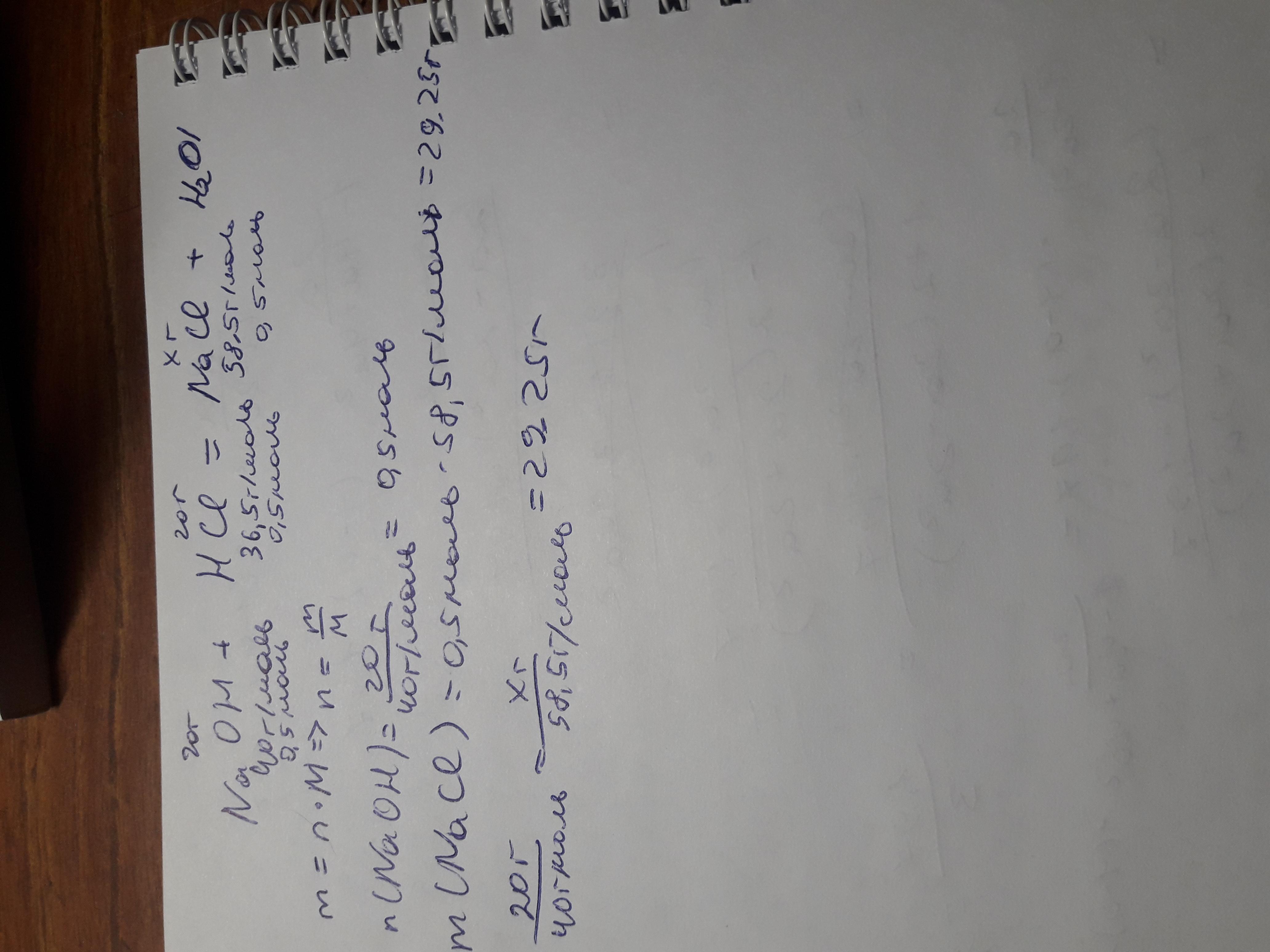 смешали растворы содержащие 20 г натрий гидроксида и 20 г хлоридной кислоты. масса образовавшиеся при этом соли равна