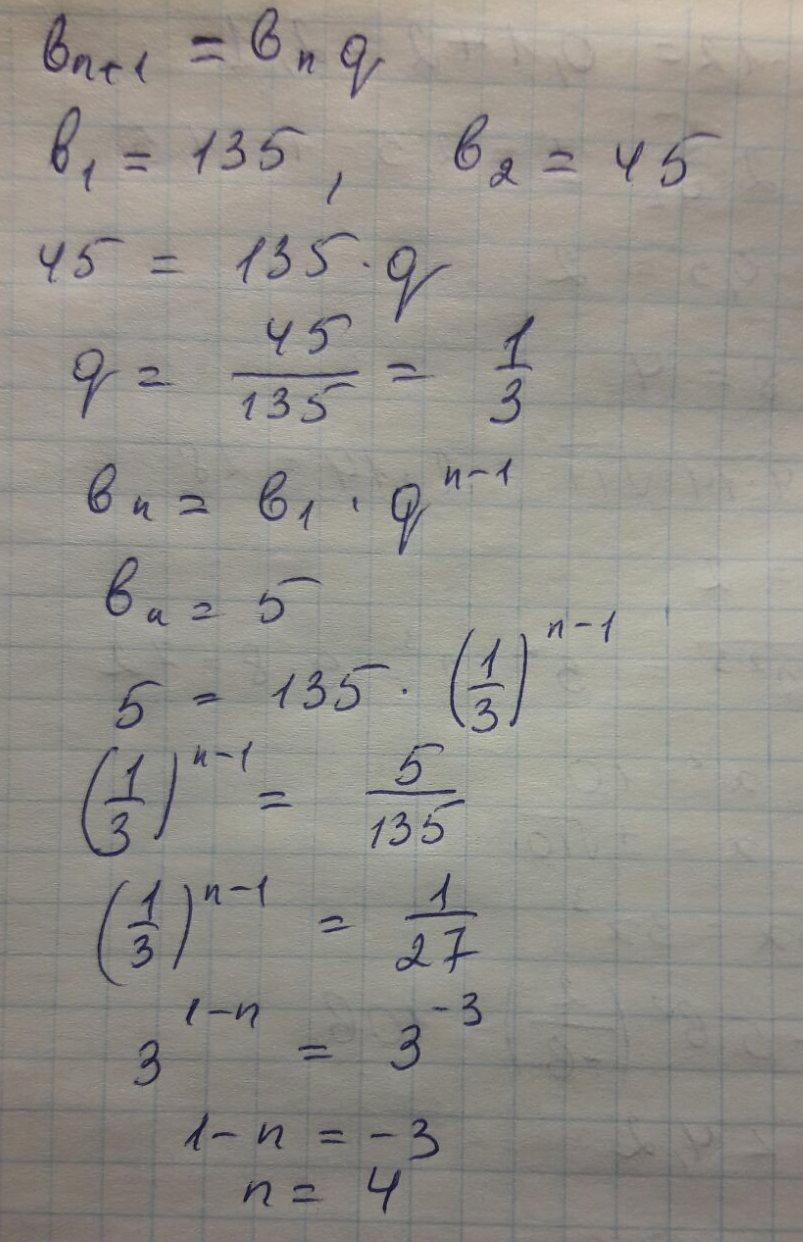 (1/3)^(n-1)=5/135; (1/3)^(n-1)=1/27; (1/3)^(n-1)=(1/3)³ ⇒n-1=3, n=4.