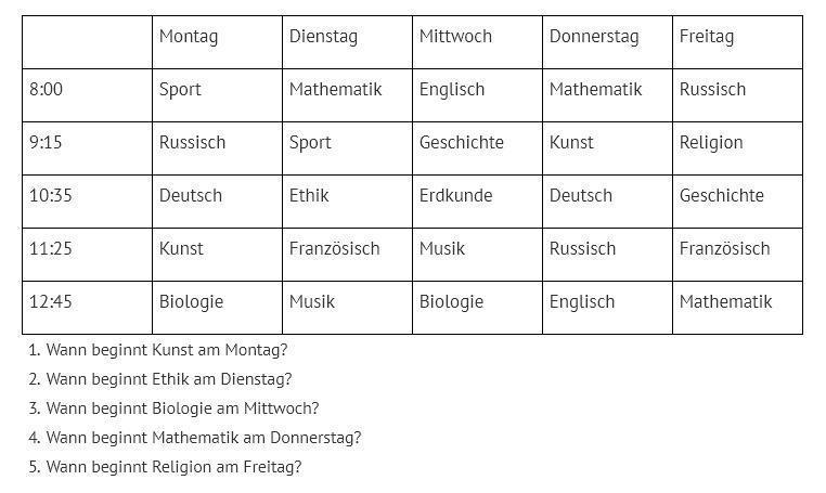 Beantworten Sie die Fragen. Необходимо кратко ответить на вопросы, используя таблицу-расписание.