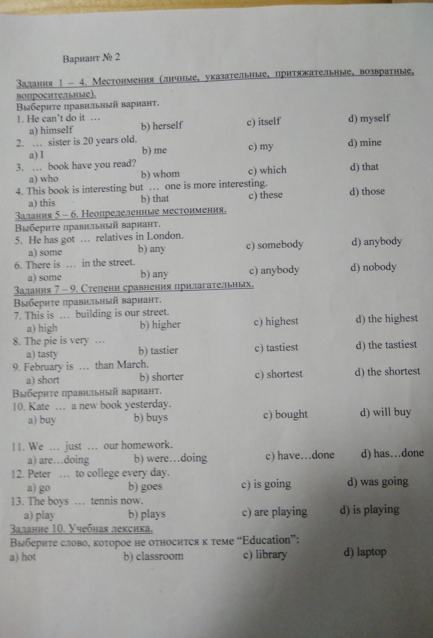 Ответ:1)a 2)c 3)c 4)b 5)a 6)d 7)c 8)a 9)b 10)c 11)b 12)b 13)c 10)a