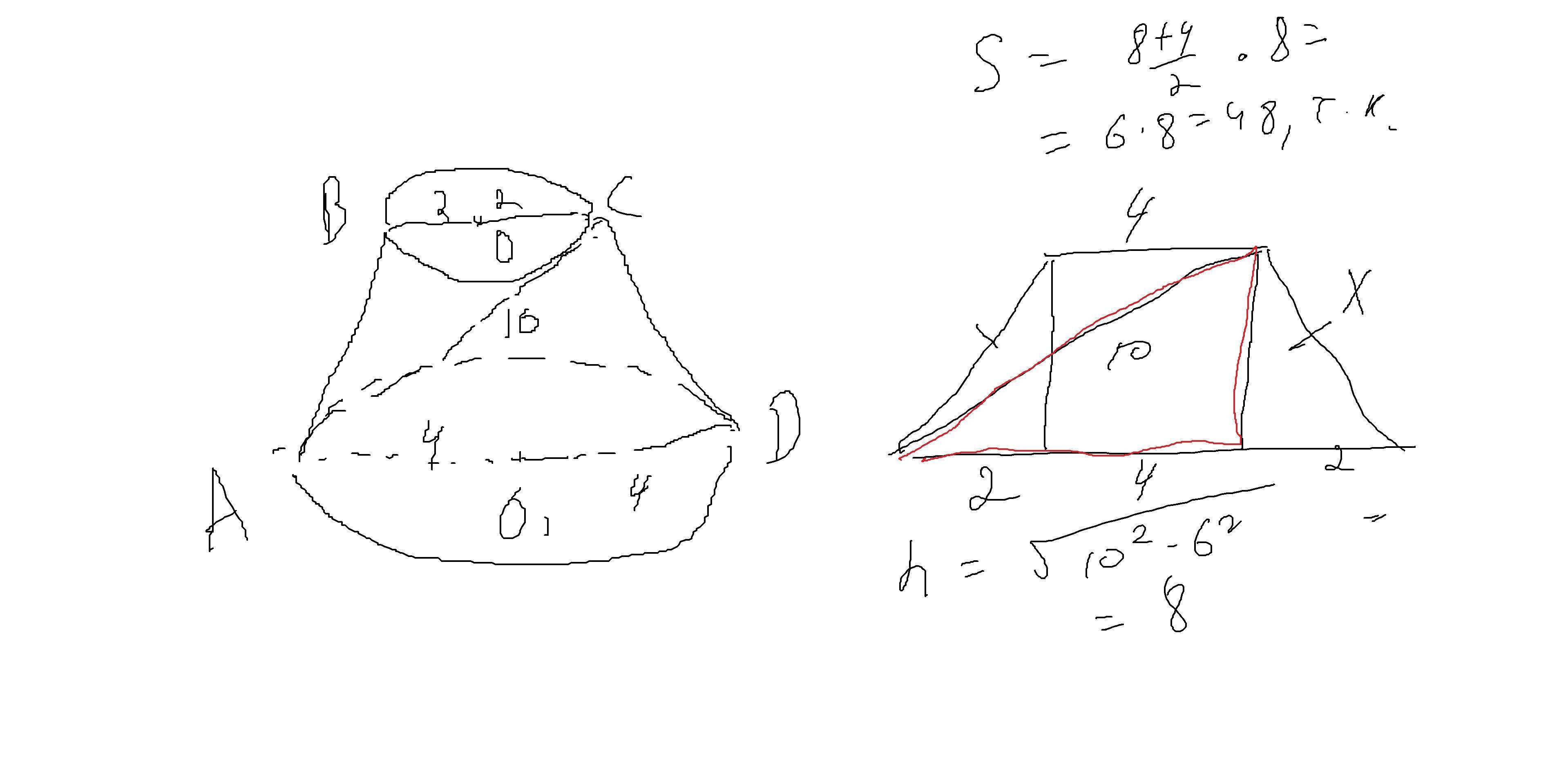 Диагональ осевого сечения усеченного конуса равна 10 см, радиус основ - 2 см и 4 см. Вычислите площадь осевого сечения усеченного конуса.