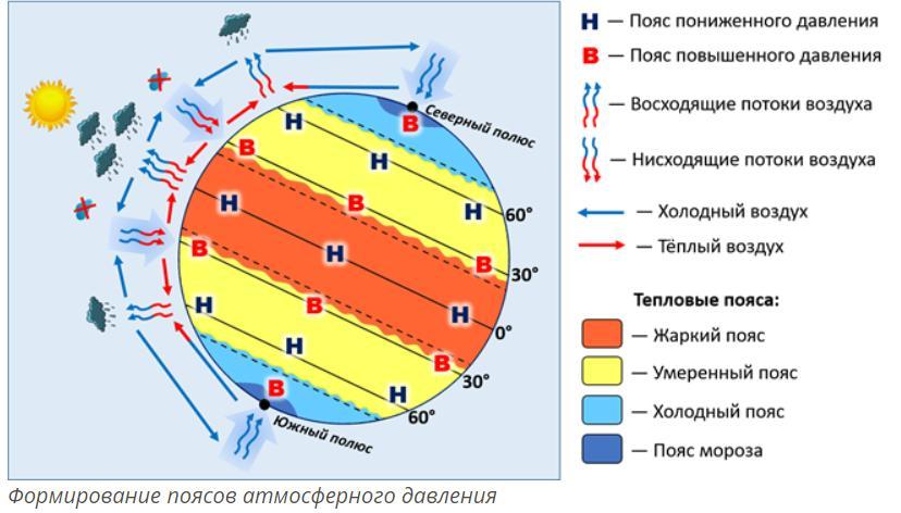 - В тропических и полярных широтах формируются пояса высокого давления.