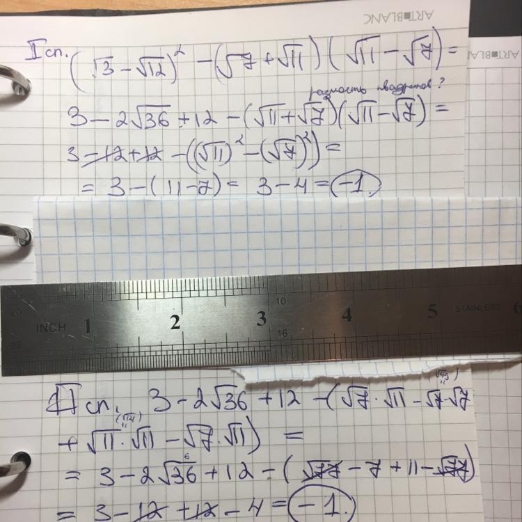 вычислите: (корень из 3 - корень из 12)в квардрате -(корень из 7+корень из 11) (корень из 11-корень из 7) (прошу ребята если кто может решите 2 способами умоля срочно даю 50 баллов только прошу 2 способами) огромное спасибо заранее