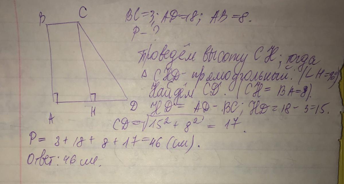 В прямокутній трапеції АВСД :ВС=3(основа);АД=18(основа);АВ=8;