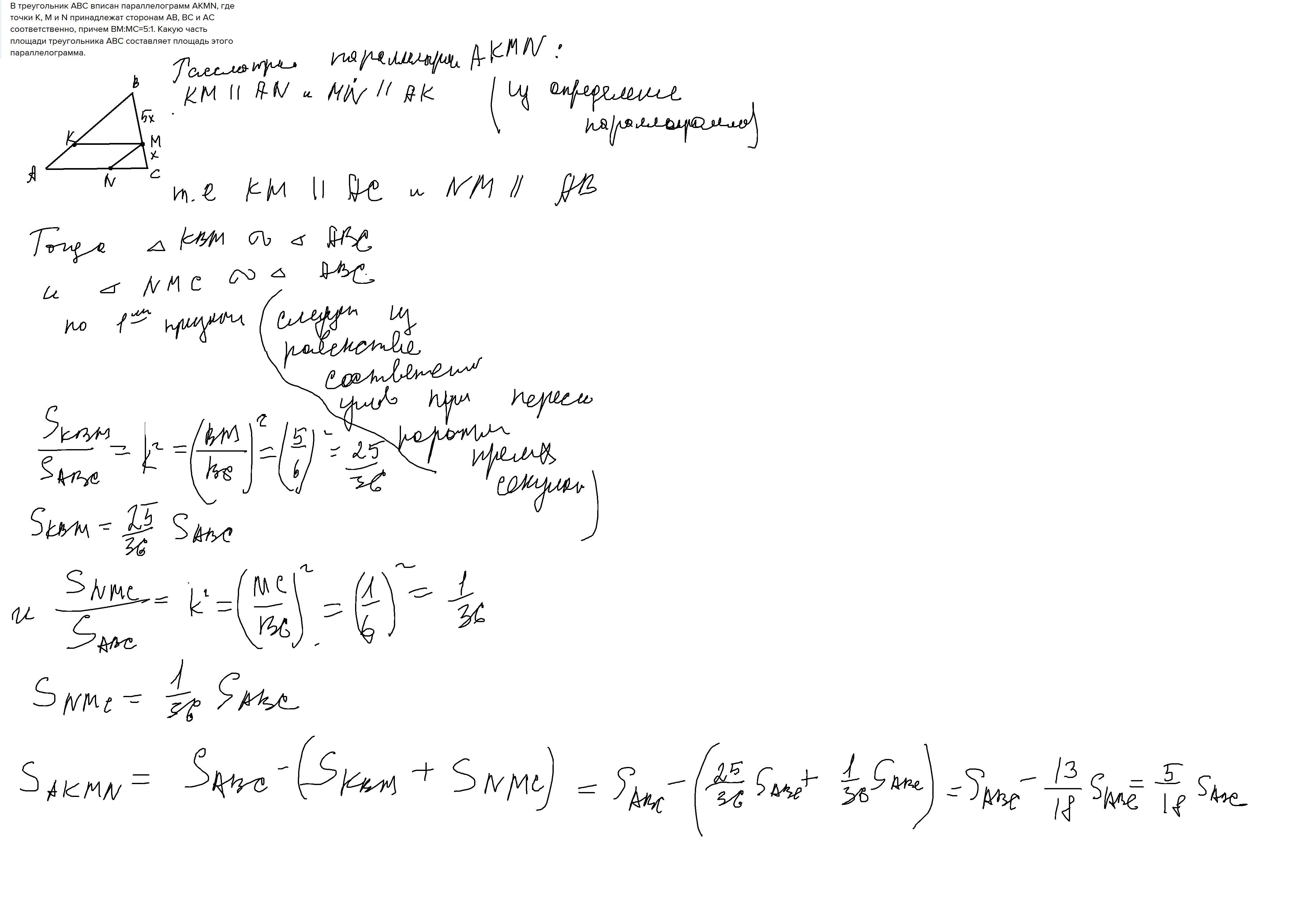 В треугольник АВС вписан параллелограмм АКМN, где точки К, М и N принадлежат сторонам АВ, ВС и АС соответственно, причем ВМ:МС=5:1. Какую часть площади треугольника АВС составляет площадь этого параллелограмма.