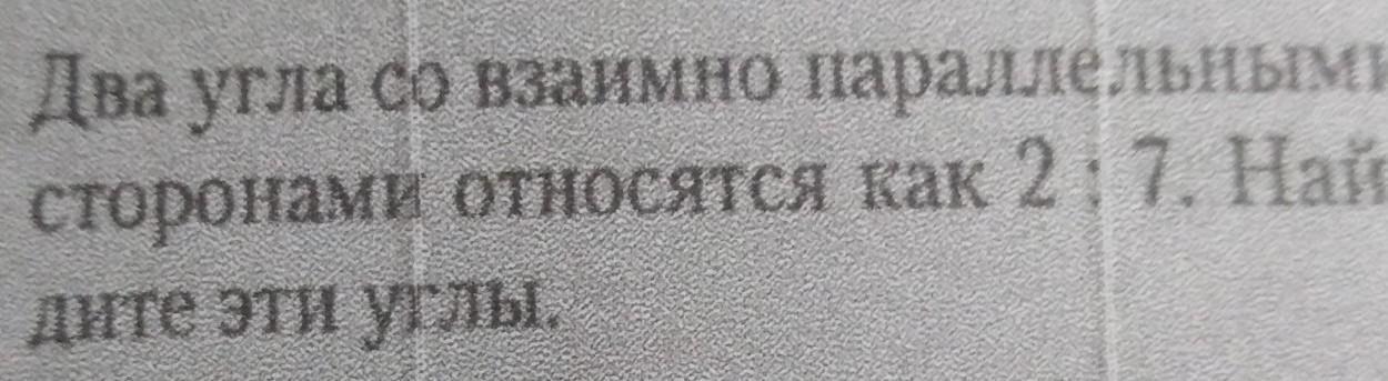 Два угла со взаимно параллельными сторонами или равны друг другу, или в сумме имеют 180°. В нашем случае они не равны и относятся друг к другу как 2:7. Тогда первый из них равен 2*180:(2 + 7) = 40°, а второй 180° - 40° = 140°.