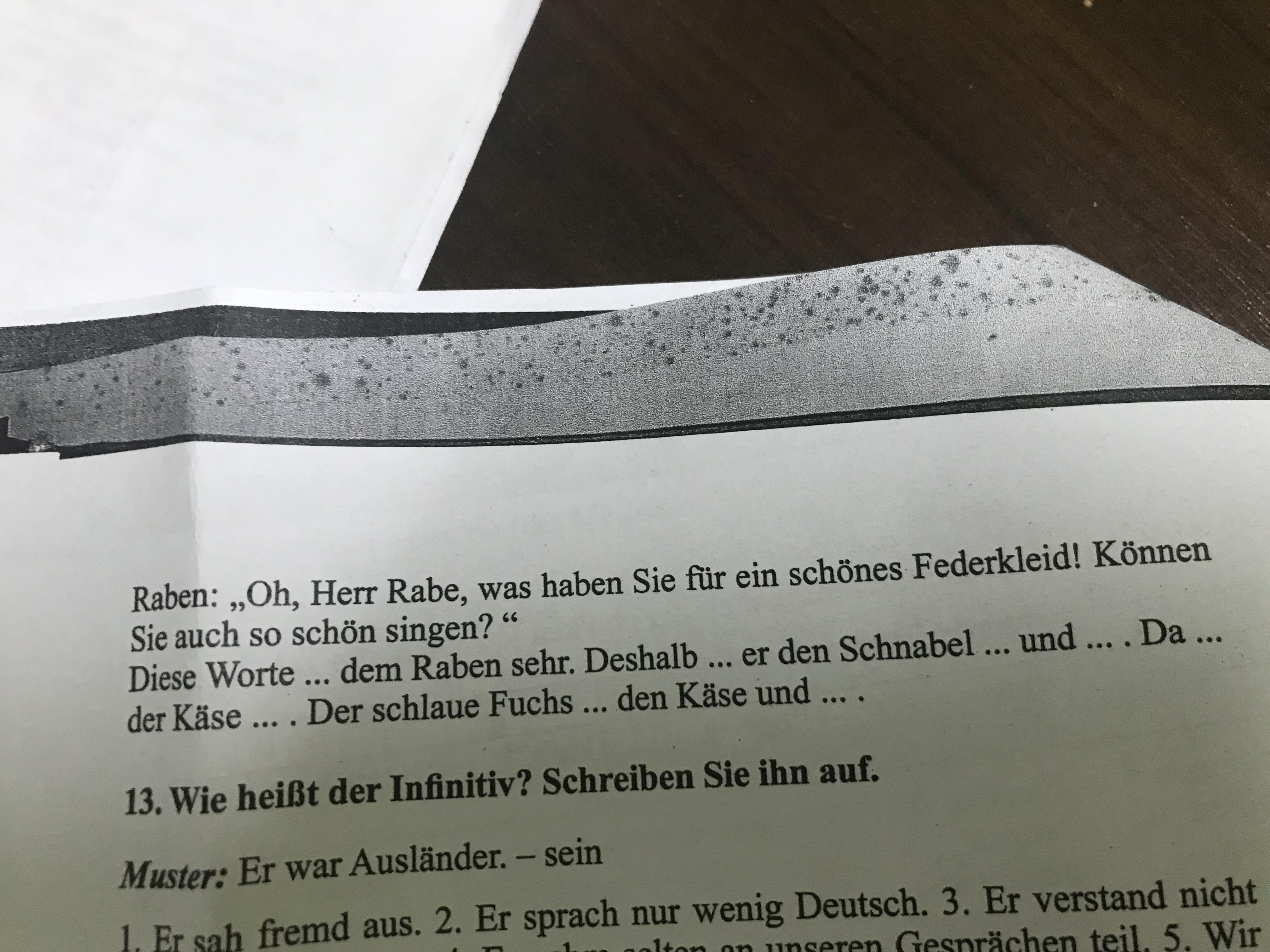 Ein Rabe hatte ein Stück Käse im Schnabel.Er flog mit dem Käse auf einen hohen Baum,um ihn dort zu essen.Von unten roch der Fuchs den Käse und sagte zum Raben ,,Oh,Herr,Rabe,was haben Sie für ein schönes Federkleid! Können Sie auch so schön singen?''Diese Worte gefielen dem Raben sehr.Deshalb machte er den Schnabel auf und sang.Da fiel der Käse herunter.Der schlaue Fuchs nahm den Käse und lief weg.