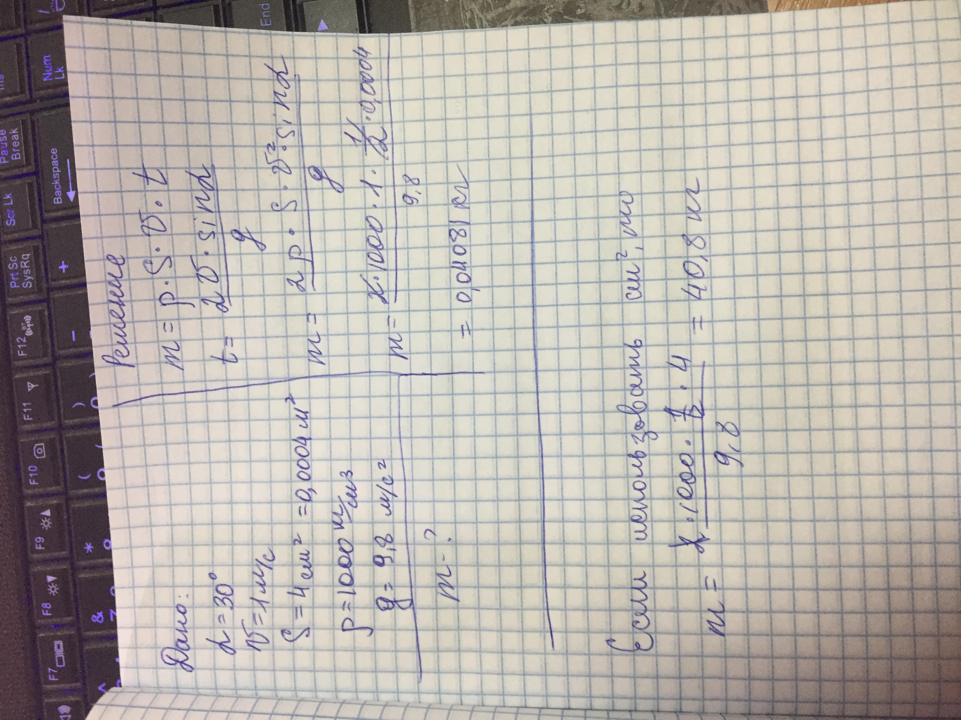 Из шланга под углом 30° бьет струя воды со скоростью v= 1 м/с . Площадь сечения струи s= 4 см^2. Найдите массу воды, которая в каждый момент времени находится в воздухе. Плотность воды ρ= 1000 кг/м^3. Ответ приведите в килограммах, округлив до десятых.