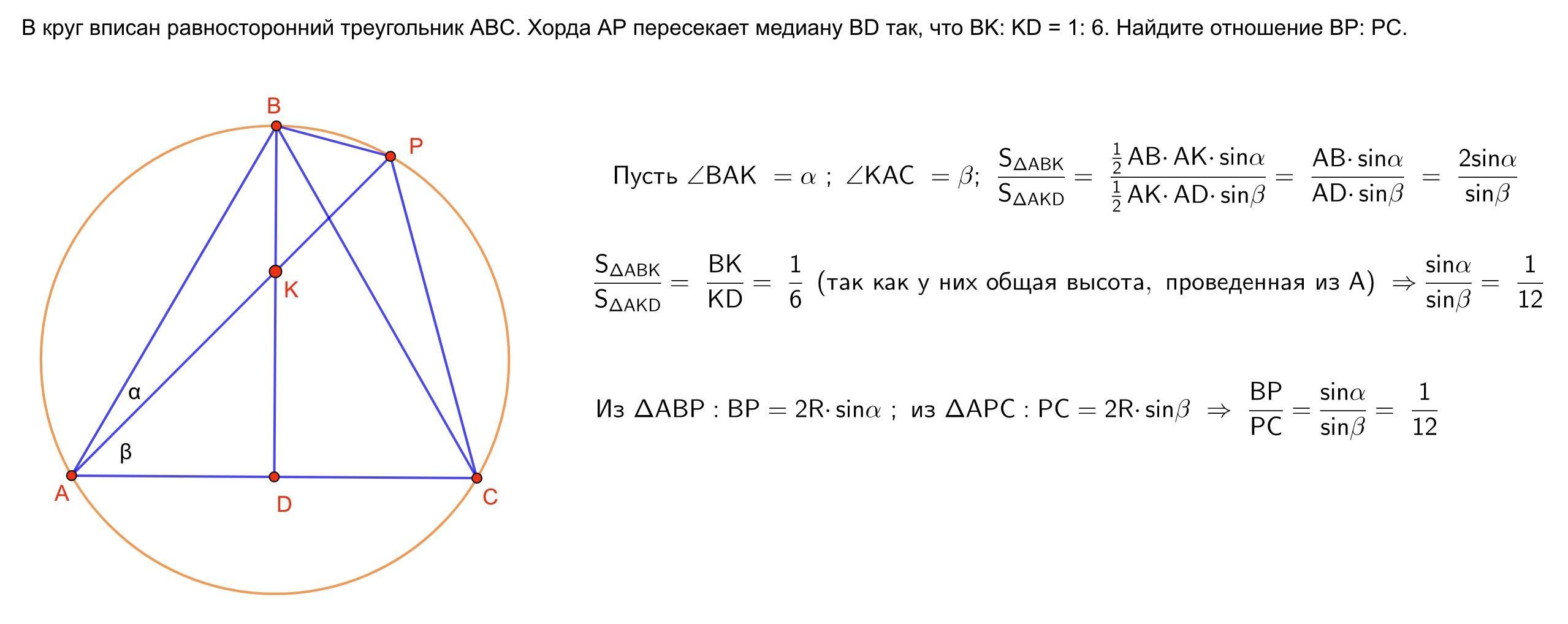 в круг вписан равносторонний треугольник ABC. Хорда AP пересекает медиану BD так, что BK: KD = 1: 6. Найдите отношение BP: PC.