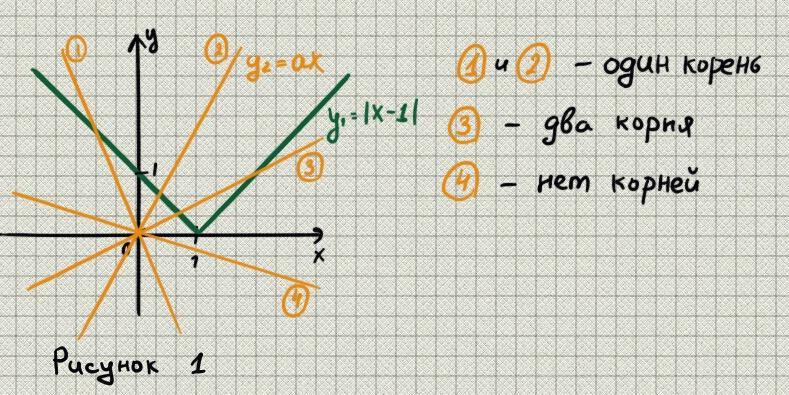 При каких значениях параметра a уравнение |x−1|=ax имеет ровно один корень?