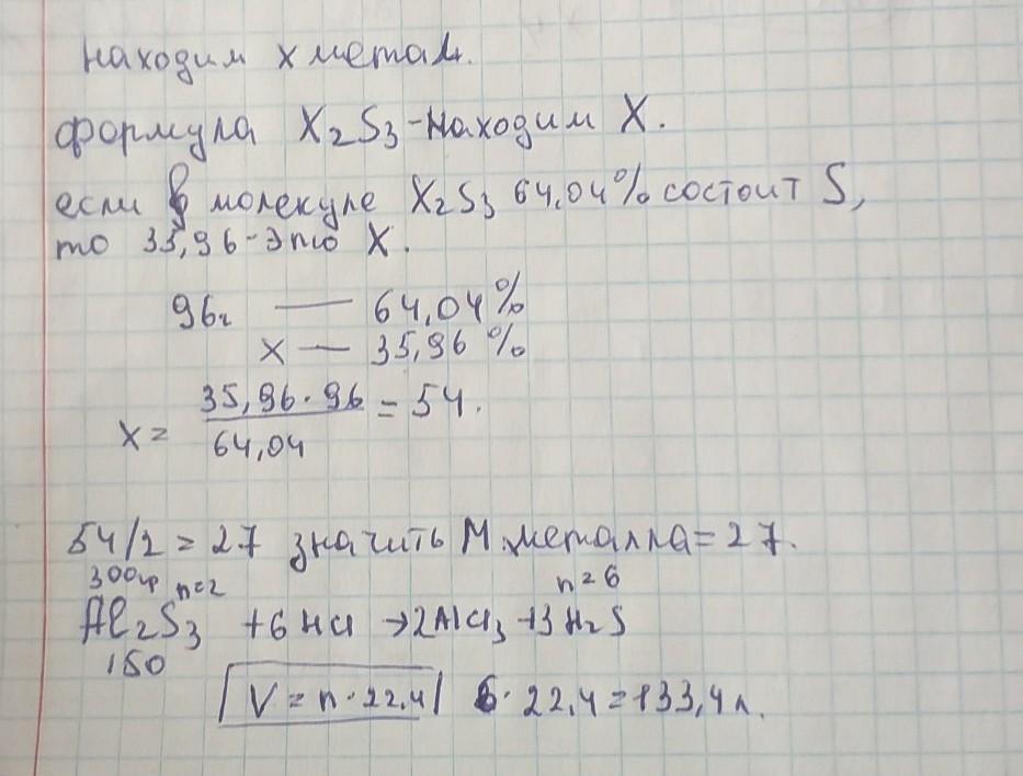 Сульфид 3-валентного металла содержит 64,04% серы. Назовите металл. Напишите уравнение реакции данного сульфида с HCl и рассчитайте, какой объем какого газа выделяется при реакции 300 г сульфида с избытком соляной кислоты.