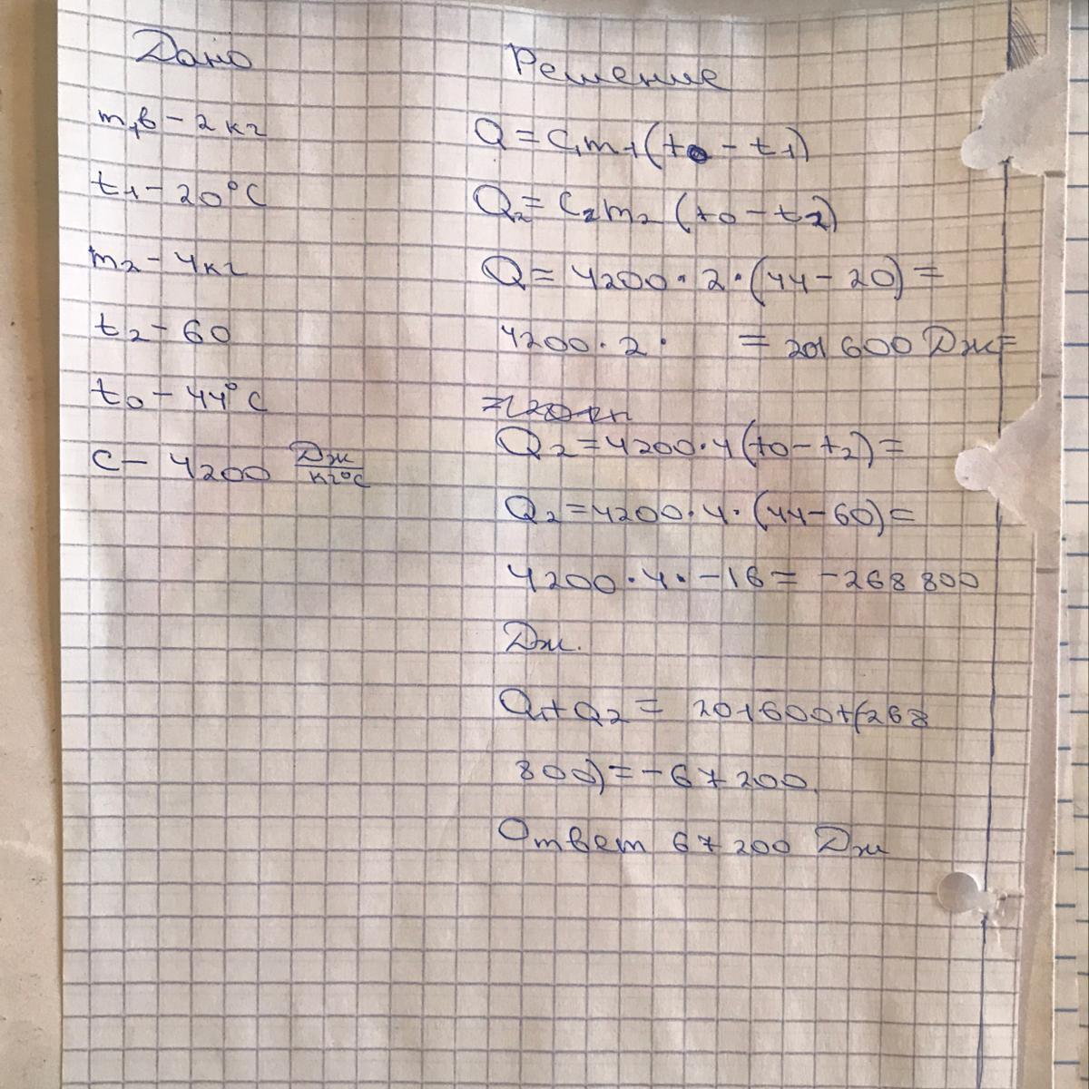 Мы смешиваем воду с массой 2 кг, температурой 20 ° С и массой 4 кг при температуре 60 ° С. Если заданная температура составляет 44 ° С. Количество тепла, потраченного на отопление