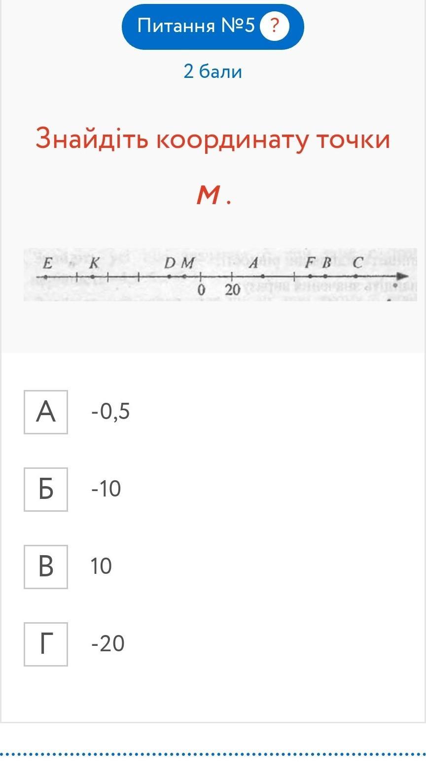 Так как один отрезок равен 20, точка M находится на половине отрезка, поэтому 20 ÷ 2 = 10, а также точка M находится слева, поэтому число будет отрицательным.