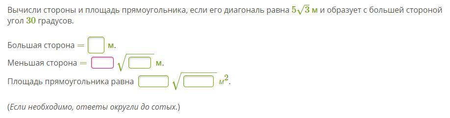 Вычисли стороны и площадь прямоугольника, если его диагональ равна 53√ м и образует с большей стороной угол 30 градусов.