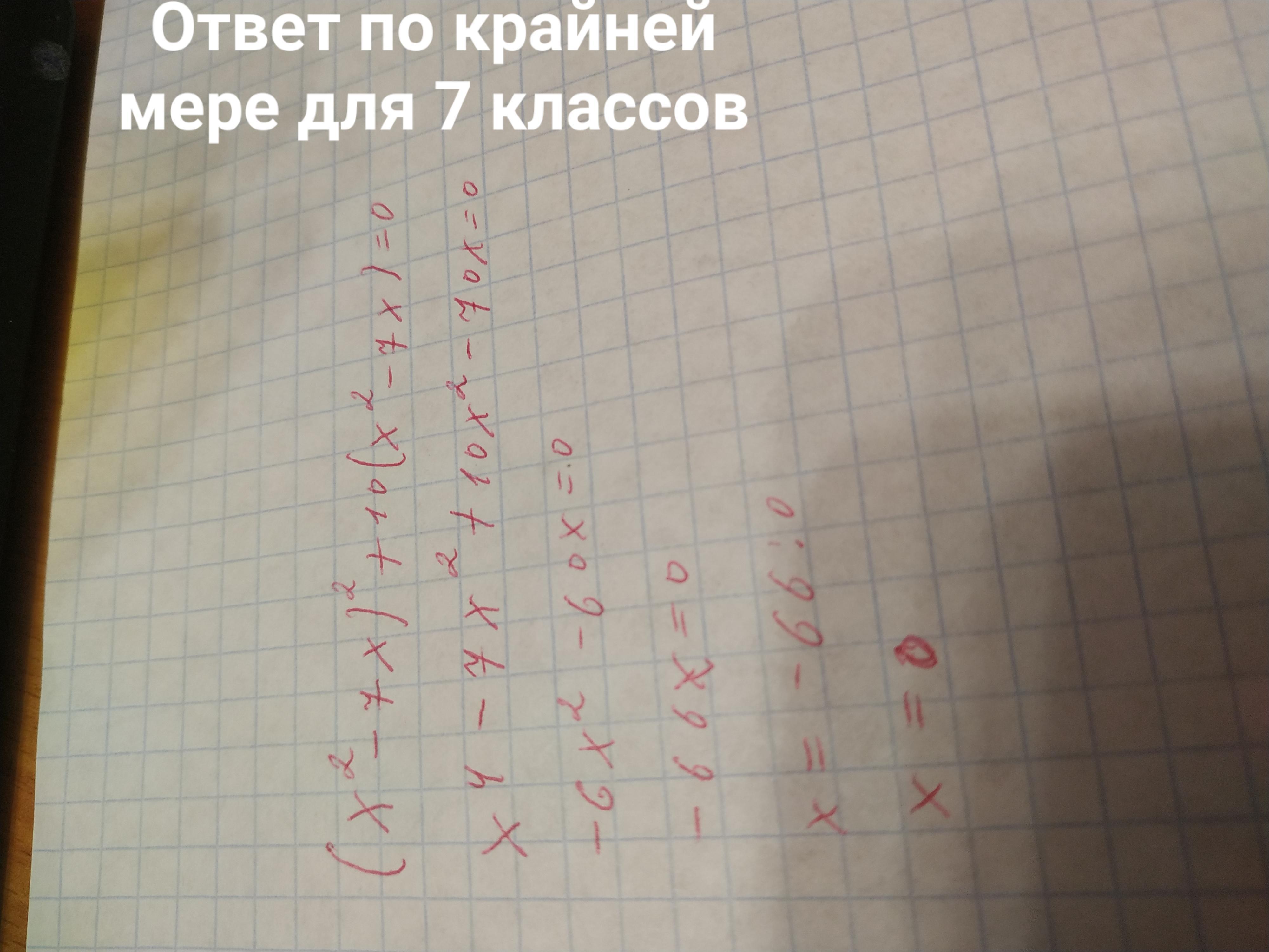 (х²-7х)²+10(х²-7х)=0. (х²-7х)(х²-7х+10)=0. х(х-7)(х²-7х+10)=0. х=0 х-7=0. х²-7х+10=0. D=9=3² . x=7. x1= 5 x2=2