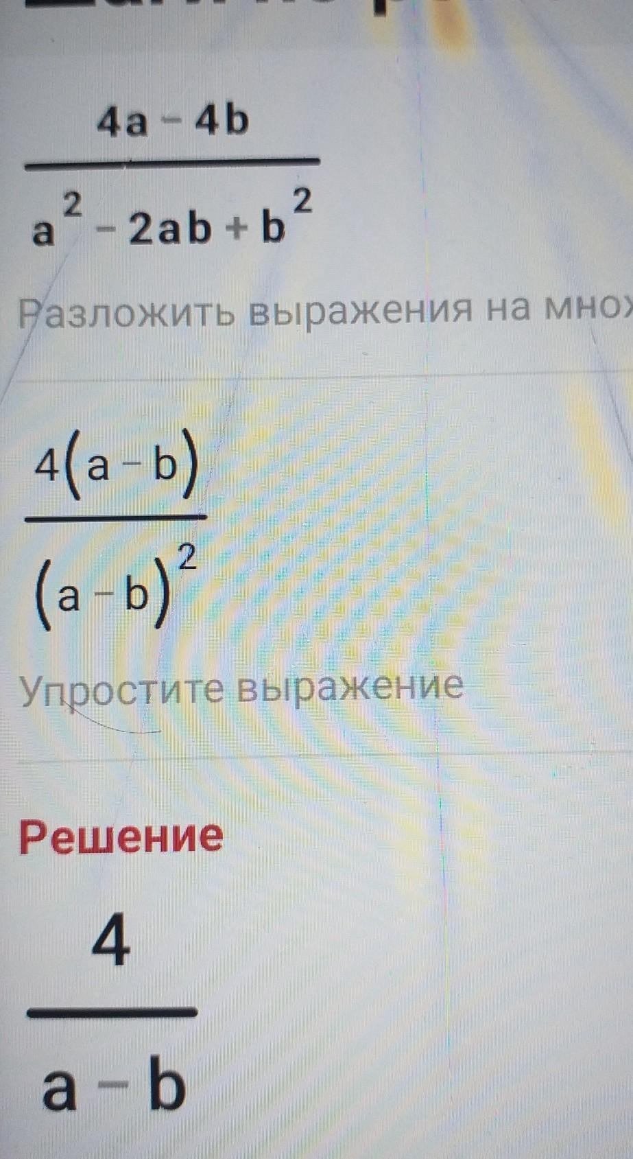 4а-4b/a^2-2ab+b^2=4(a-b)/(a-b)^2=4/a-b