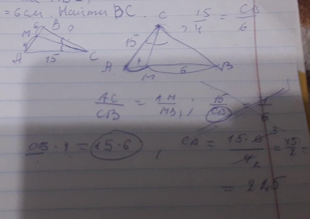 СРОЧНО! Даю 100 баллов. Отрезок СМ - биссектриса треугольника АВС, АС=15см, АМ=4см, ВМ=6см. Найти ВС