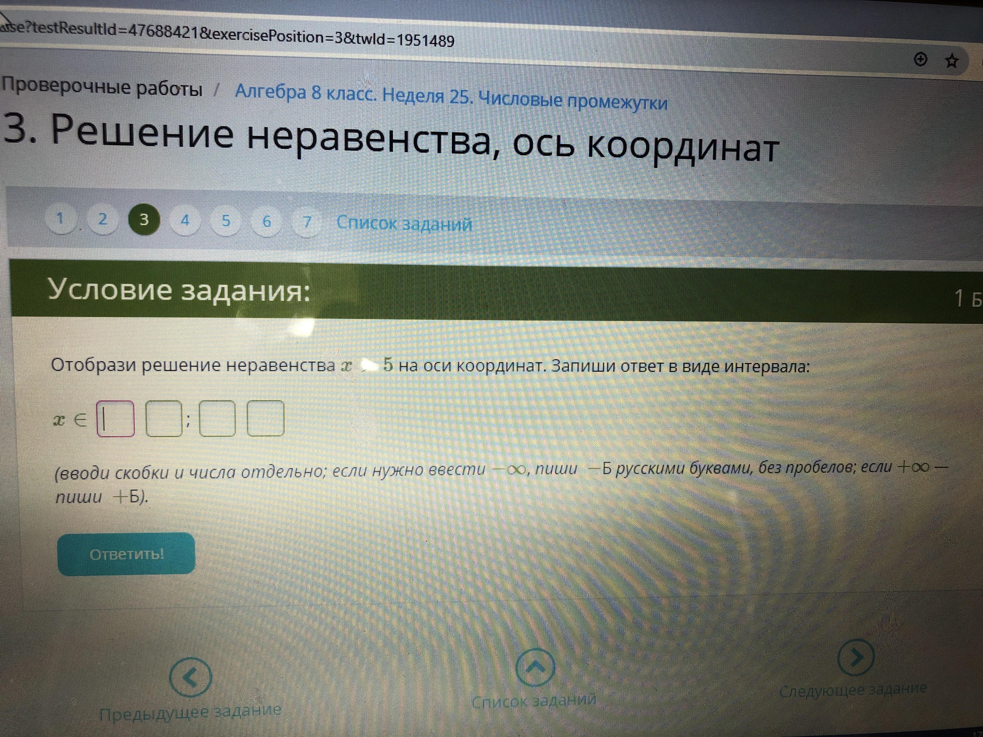 3. Отобрази решение неравенства х>5 на оси координат. Запиши ответ в виде интервала: х€ ??;??