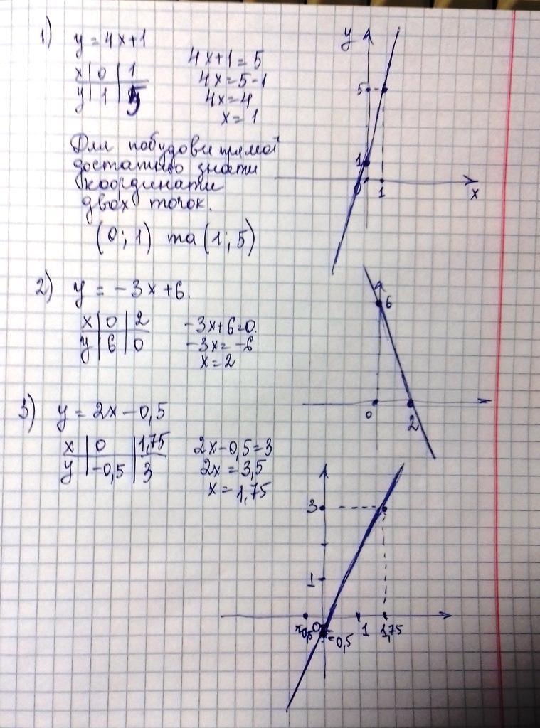 Побудувати график функций y=4x+1, y+-3x+6, y=2x-0.5