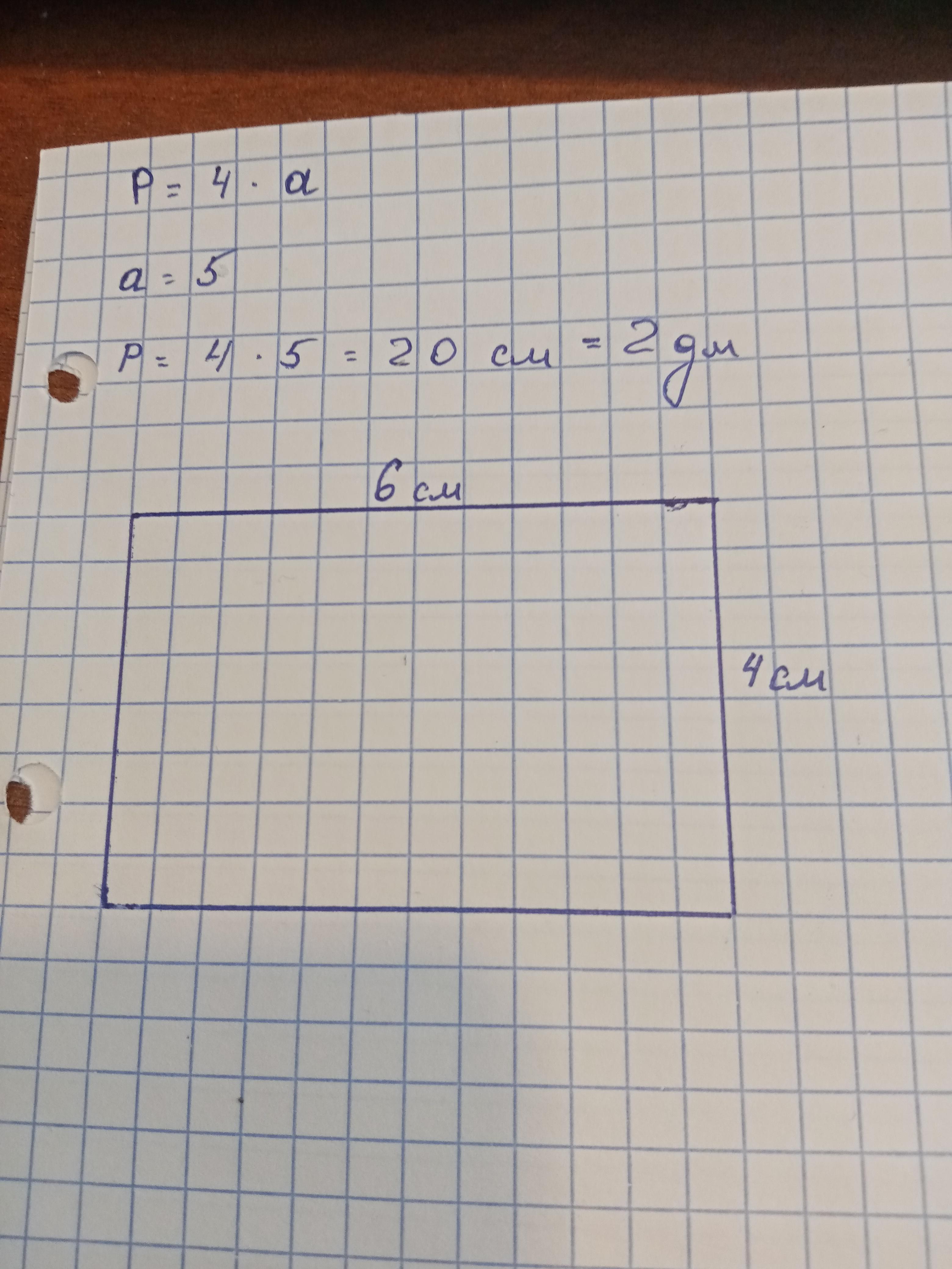 Длина стороны квадрата 5 см. Чему равен периметр этого квадрата? Вырази периметр этого квадрата в дециметрах. Построй прямоугольник с таким же периметром.