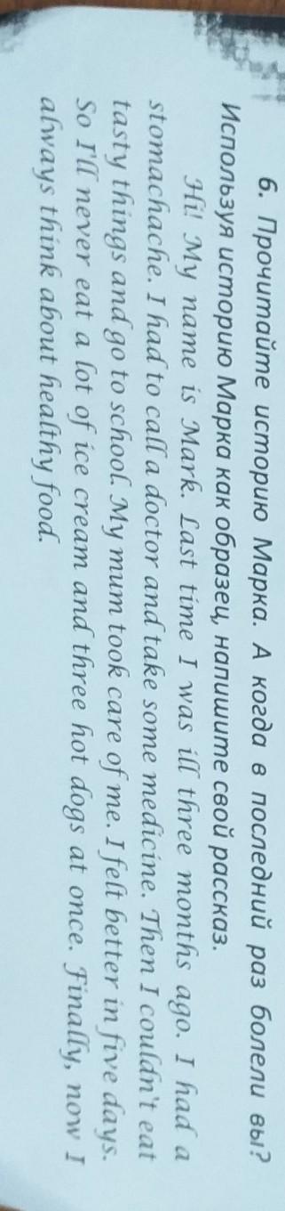 Ответ: Hello! My name is Olesya. The last time I was sick two months ago. I had a sore throat and cough. I was very ill. I went to the hospital and I was prescribed medication. My mom took care of me. I felt better after a few days. Now I will take good care of myself to not get sick.